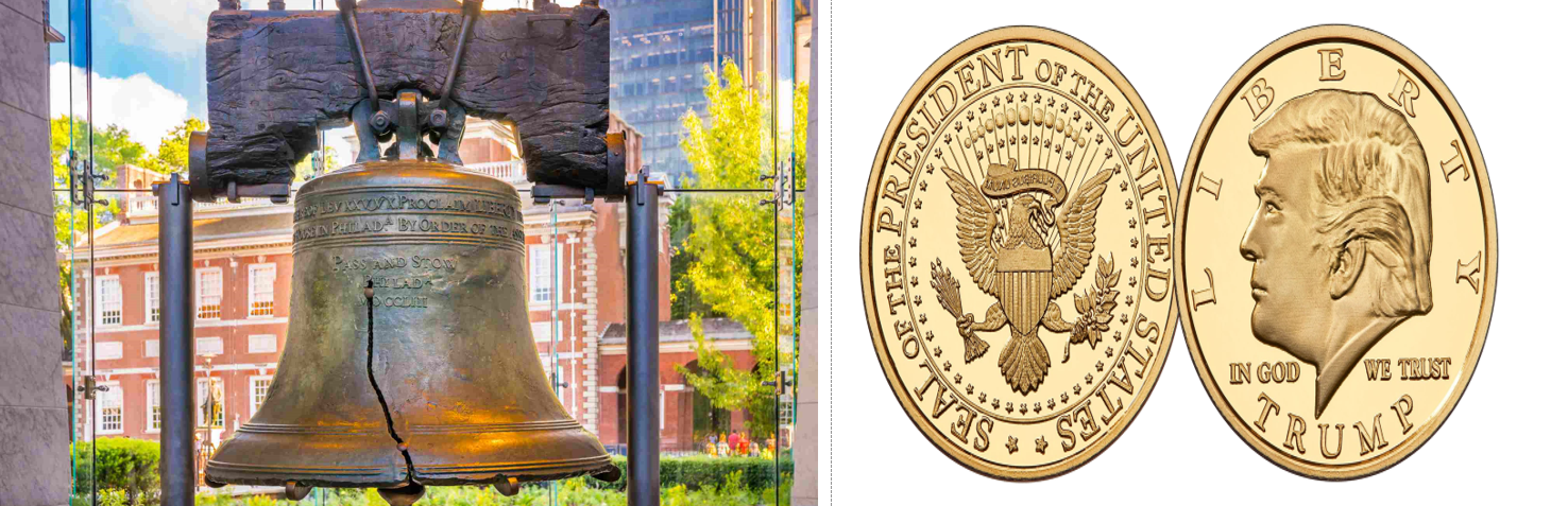 The Liberty Bell was commissioned in 1751. It is a traditional symbol of U.S. freedom and independence, and it is said to have been rung at the first public reading of the Declaration of Independence in 1776. The Liberty Bell is also the perfect material to be melted down and turned into Trump coins
